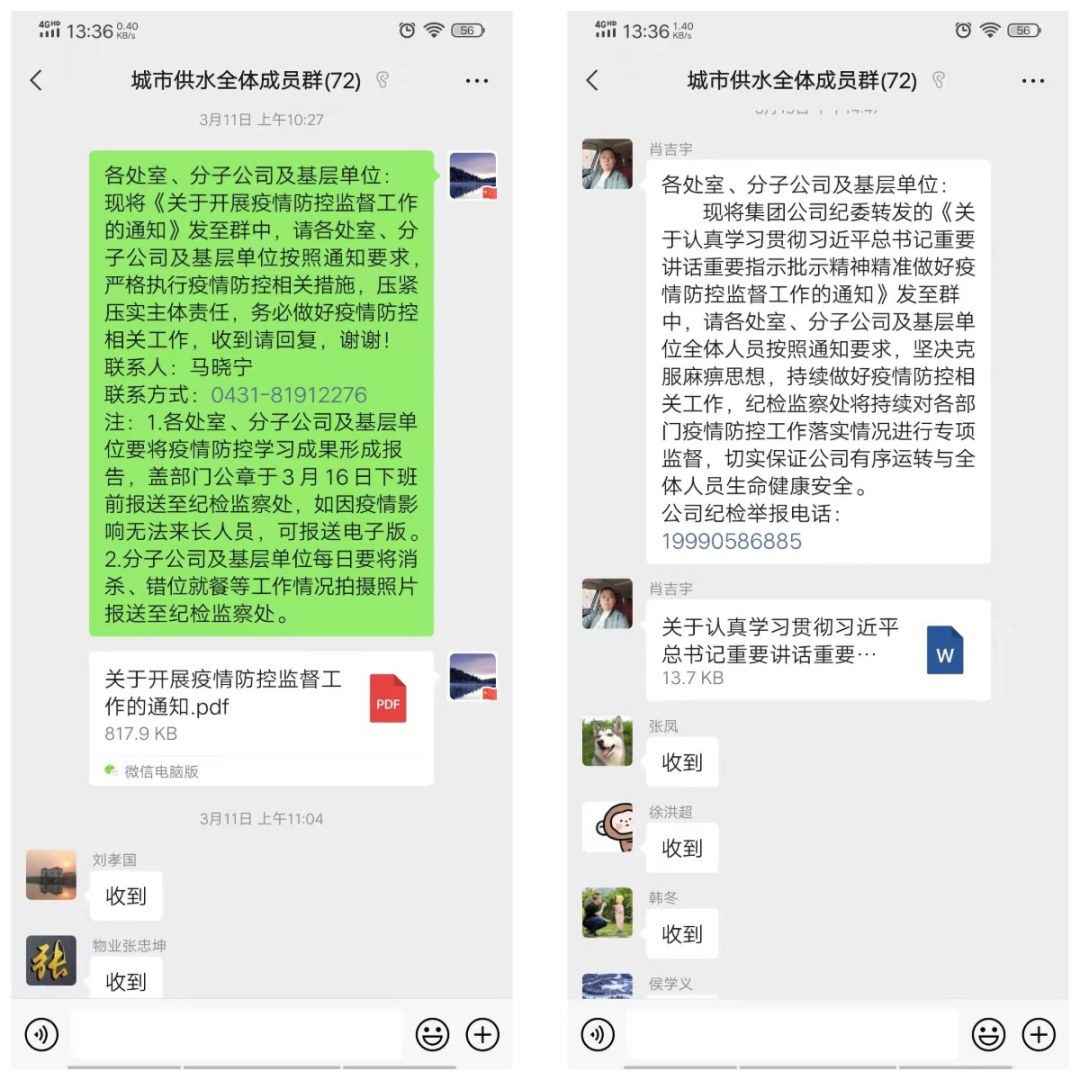 疫情就是命令,防控就是责任。疫情来临之际,在集团公司纪委及供水公司党总支的坚强领导下,供水公司纪检监察处切实履行监督责任,持续强化跟进、精准、全程监督,及时传达各项通知要求,推动公司疫情防控各项措施落地落实。