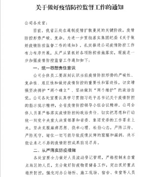 公司党支部紧跟集团纪委要求,着眼政治监督,主动担责尽责,以更严明的纪律规矩,对疫情防控工作进行全过程监督检查,确保疫情防控各项工作任务不打折扣落到实处,坚决维护全体员工生命健康安全,以优良的作风为疫情防控和复工复产工作提供坚强保障。督促领导干部靠前指挥、履职尽责,决不允许有令不行、有禁不止,违抗组织命令;决不允许弄的虚作假、瞒报漏报,贻误防控时机;决不允许底数掌握不清、情况了解不明,工作效率低下;决不允许造谣传谣、失密泄密,发表不当言论。对在疫情防控工作中存在违规违纪违法行为的干部员工,将依规依纪依法严肃追责问责。