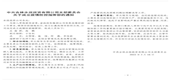 吉林终有吉临时,长春定复往常春。吉林水投投资有限公司将在省委、省政府、省国资委和集团公司的坚强领导下,进一步压实责任,有序推动防控力量下沉,全力做好疫情防控各项工作,勇担国企责任使命,坚决打赢疫情防控阻击战歼灭战。