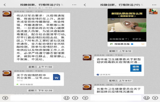 (三)注重心理疏导,做好人文关怀。水投投资公司党支部在疫情期间致全体员工了一封信,公司领导提醒大家要严格遵守防疫要求,坚持服务服从防控大局,坚决把疫情防控作为当前工作的重中之重。积极响应疫情期间居家办公要求,积极配合防疫部门做好流调排查、人员管控、核酸检测和生活保障等防控措施,做到应隔尽隔、应检尽检。同时在居家办公期间,落实好疫情防控工作要求,安排好各自工作,确保疫情后复工复产等工作,同时要保持积极向上的乐观心态,确保封闭期间真正做到稳得住、蹲得住、守得住。