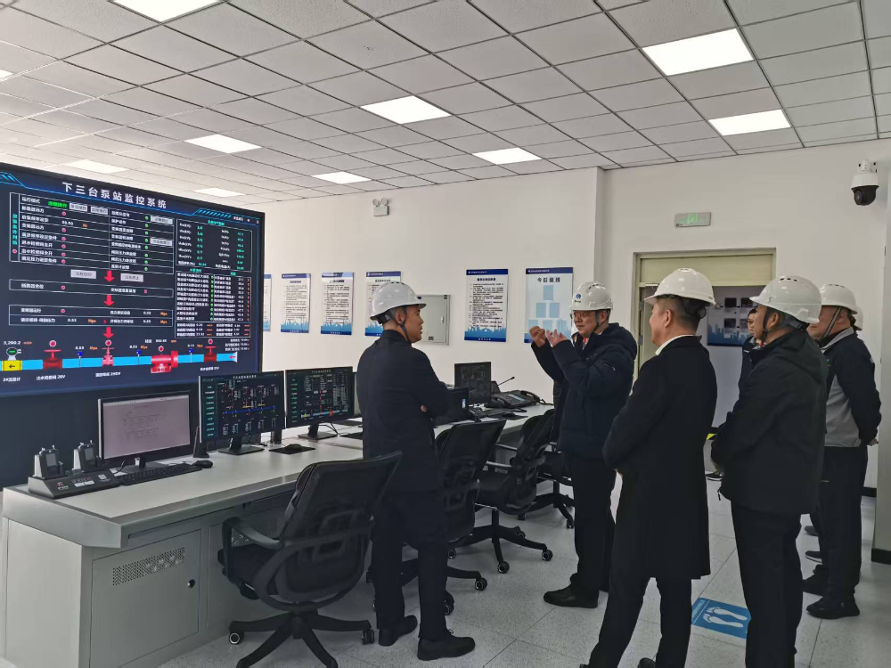调研组深入四平泵站,在中控室察看1#至4#机组运行监控画面、10kV主接线运行状态及告警光字牌响应机制,并听取泵站机组日常运维、设备检修保障、应急处置流程和运行调度优化、供需平衡调节等情况介绍。