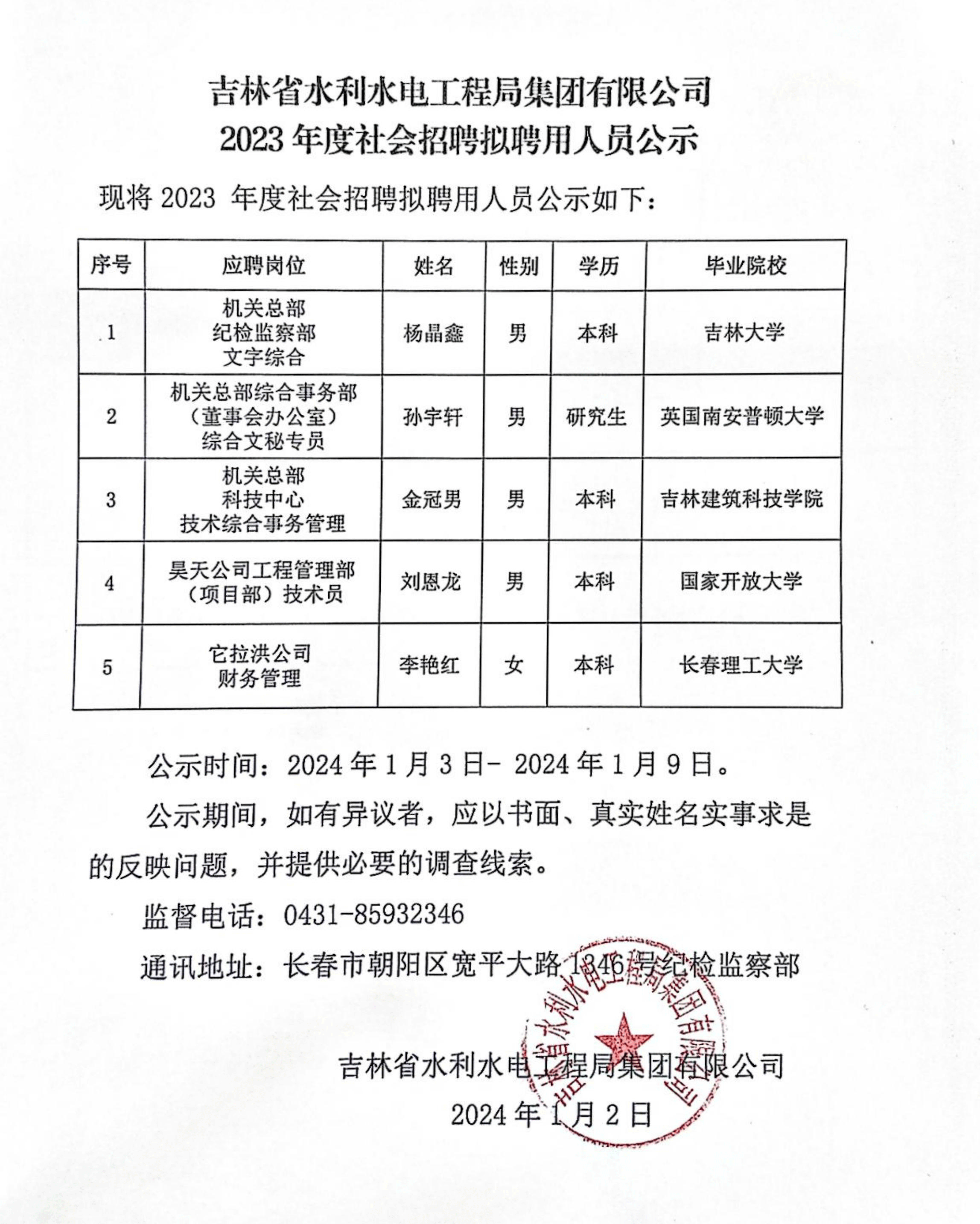 吉林省水利水电工程局集团有限公司2023年度社会招聘拟聘用人员公示