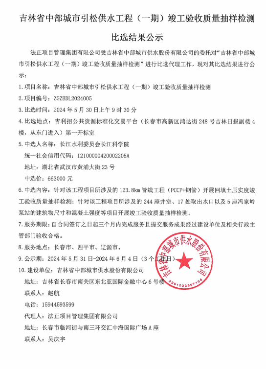 吉林省中部城市引松供水工程(一期)竣工验收质量抽样检测比选结果公示