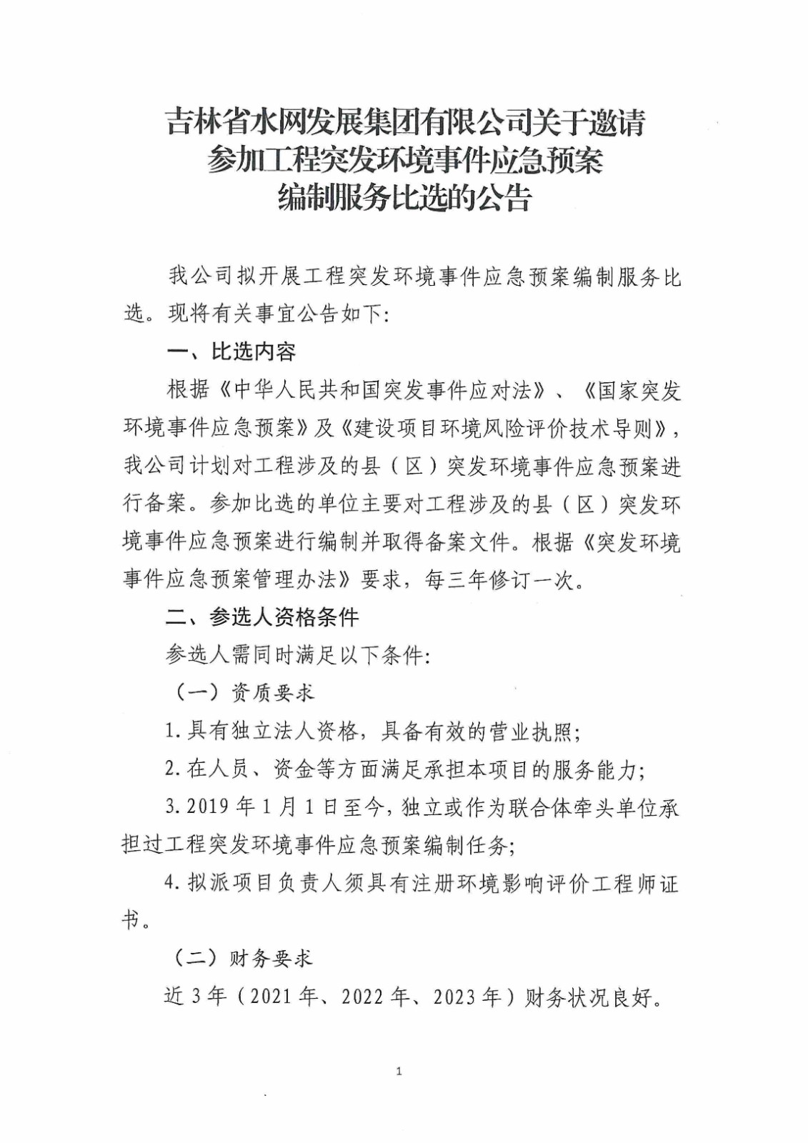 吉林省水网发展集团有限公司关于邀请参加工程突发环境事件应急预案编制服务比选的公告