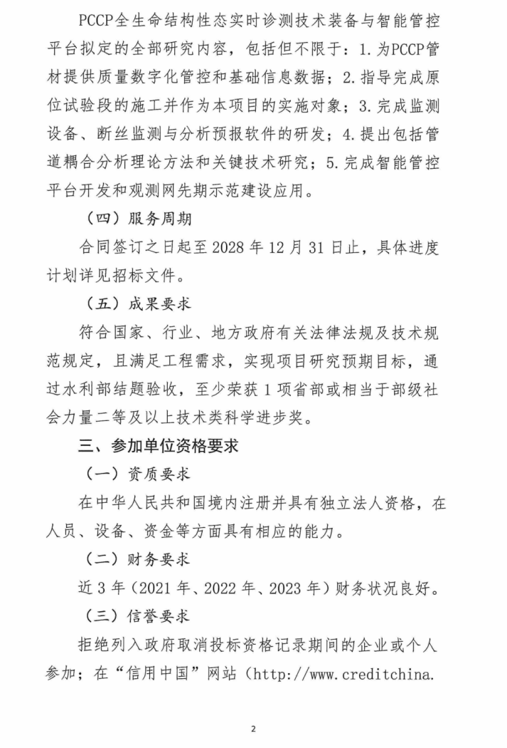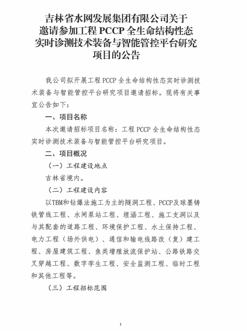 吉林省水网发展集团有限公司关于邀请参加工程PCCP全生命结构性态实时诊测技术装备与智能管控平台研究项目的公告