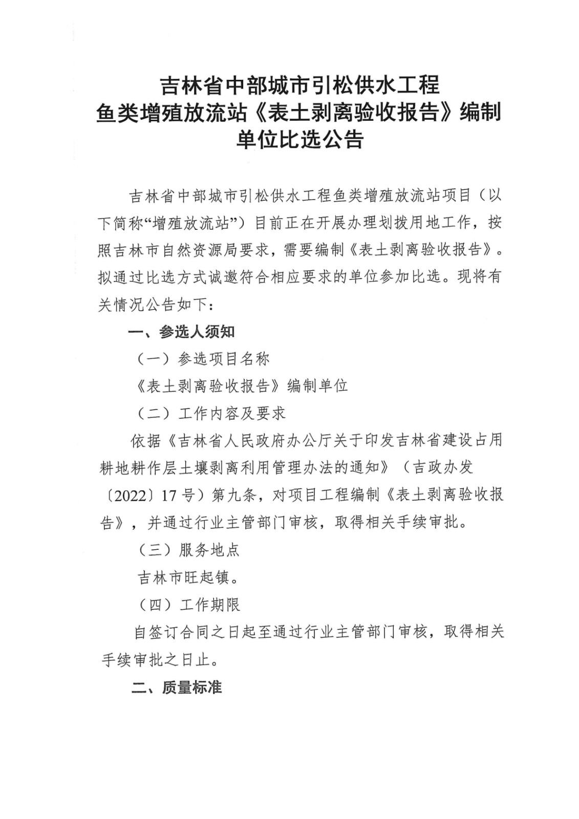 吉林省中部城市引松供水工程鱼类增殖放流站《表土剥离验收报告》编制单位比选公告