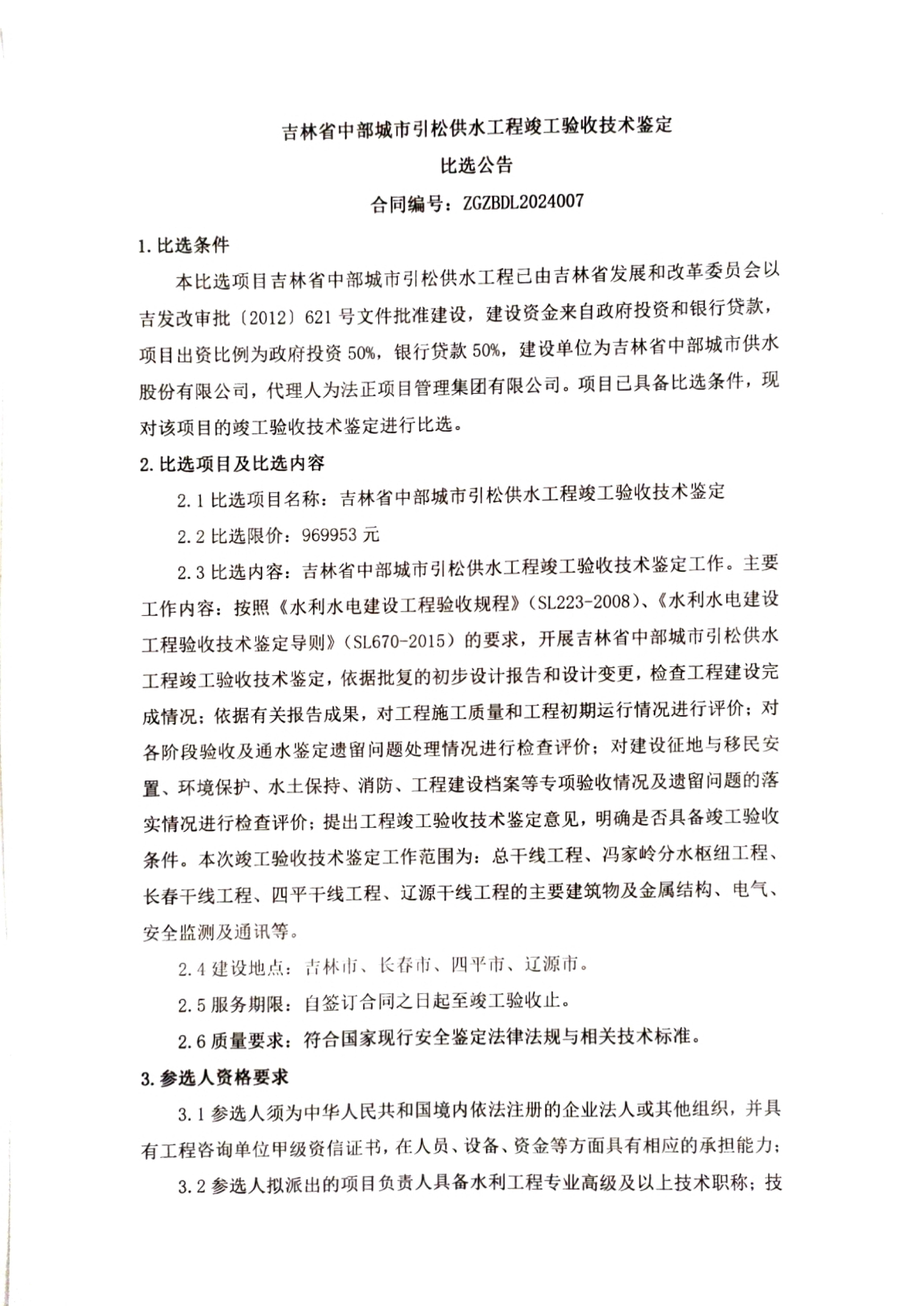 吉林省中部城市引松供水工程竣工验收技术鉴定
