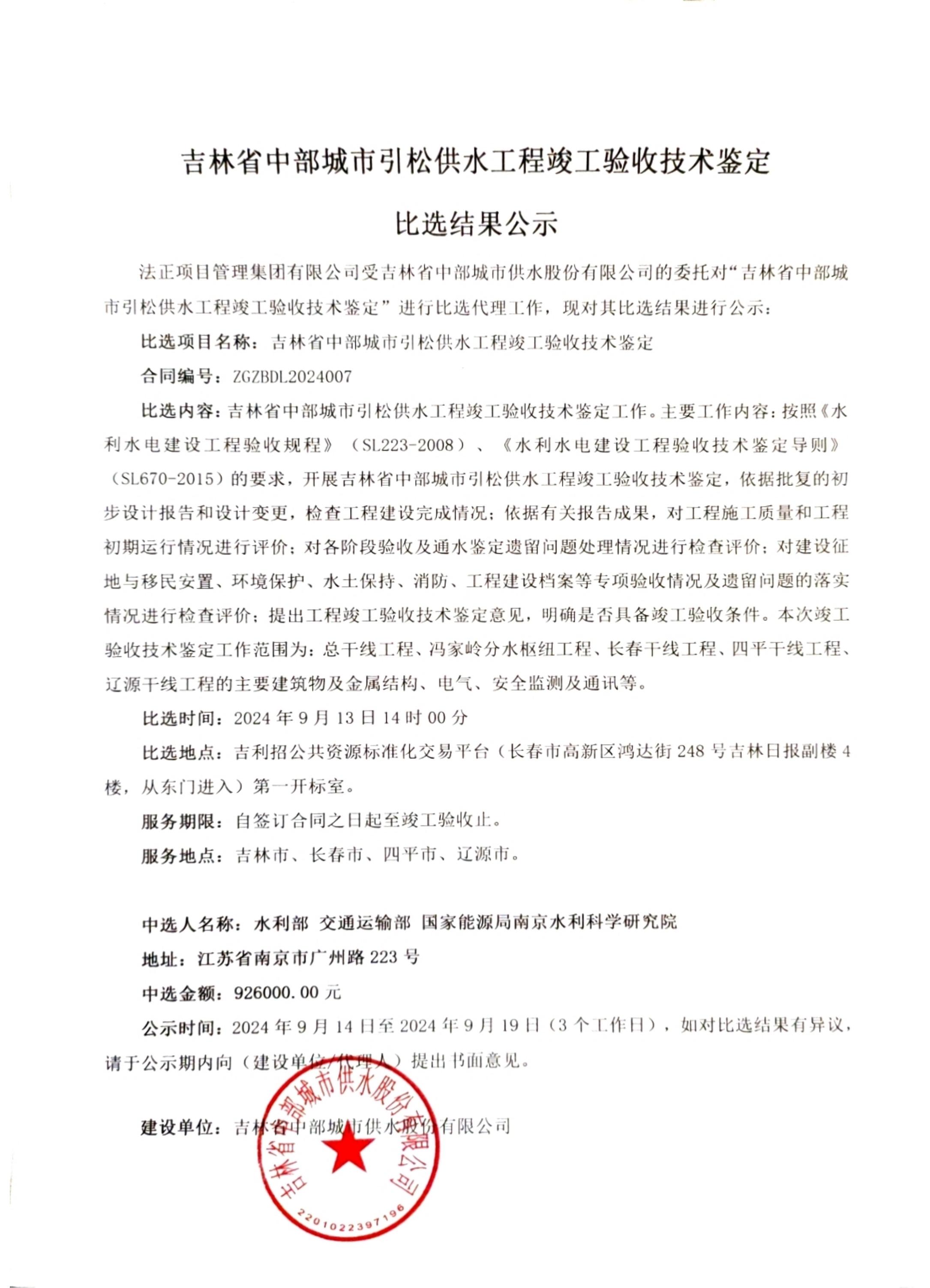 吉林省中部城市引松供水工程竣工验收技术鉴定比选结果公示