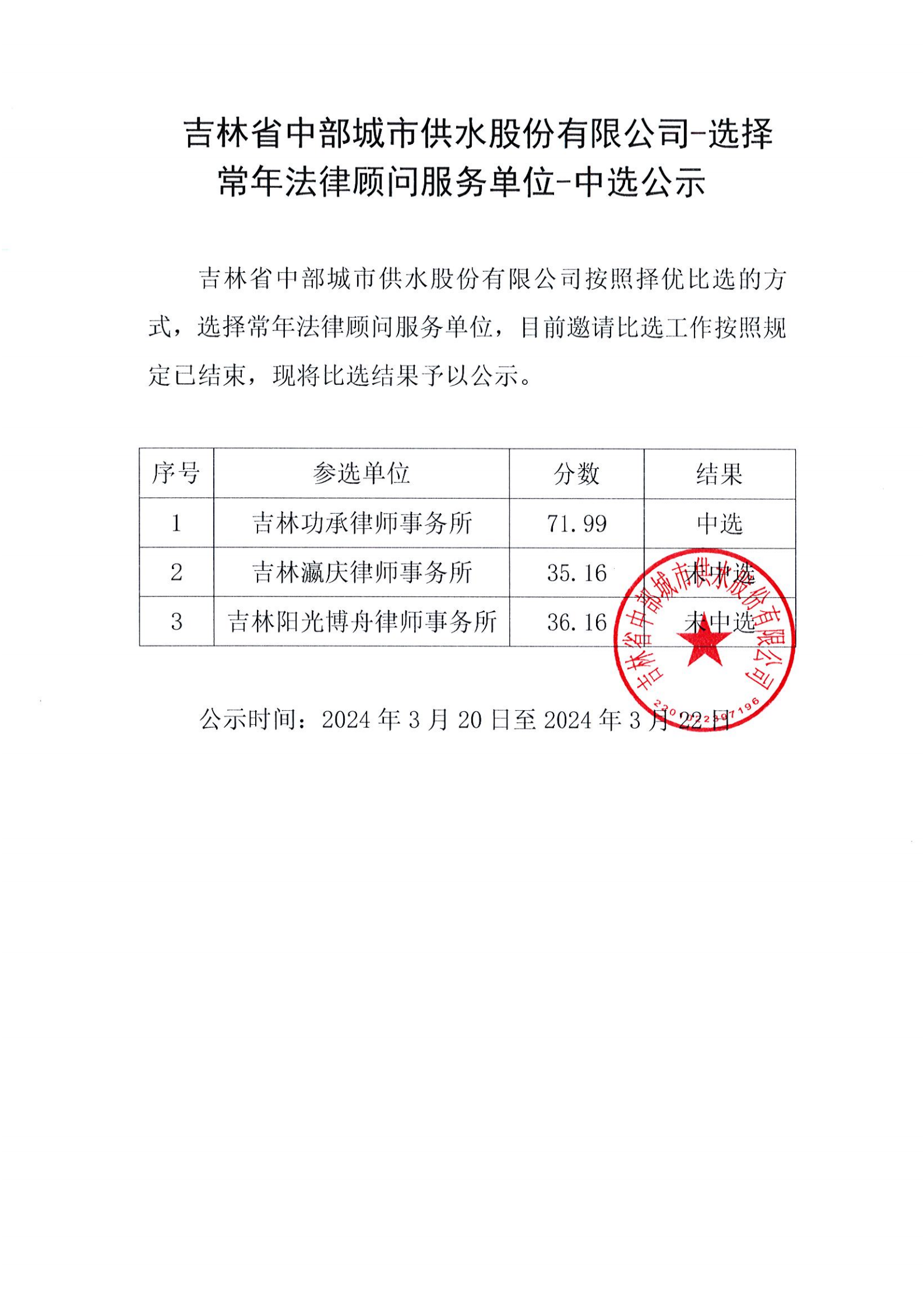 吉林省中部城市供水股份有限公司常年法律顾问服务单位-中选公示