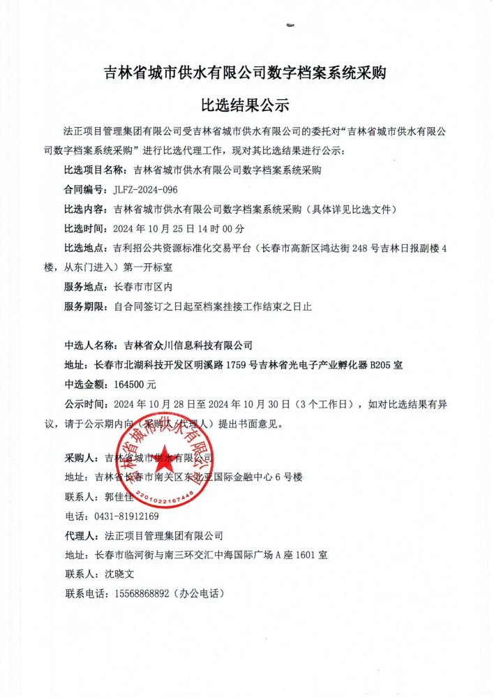 吉林省城市供水有限公司数字档案系统采购比选结果公示