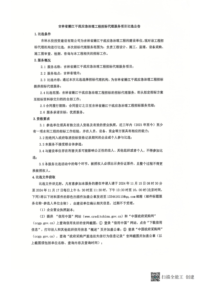 吉林省嫩江干流应急治理工程招标代理服务项目比选公告