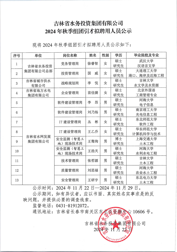 吉林省水务投资集团有限公司2024年秋季组团引才拟聘用人员公示