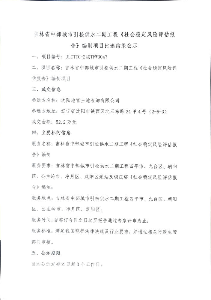 吉林省中部城市引松供水二期工程《社会稳定风险评估报告》编制项目比选结果公示