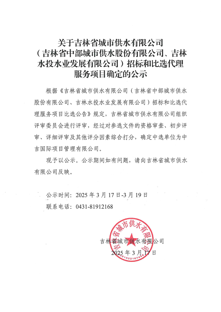 吉林水投水业发展有限公司)招标和比选代理服务项目确定的公示