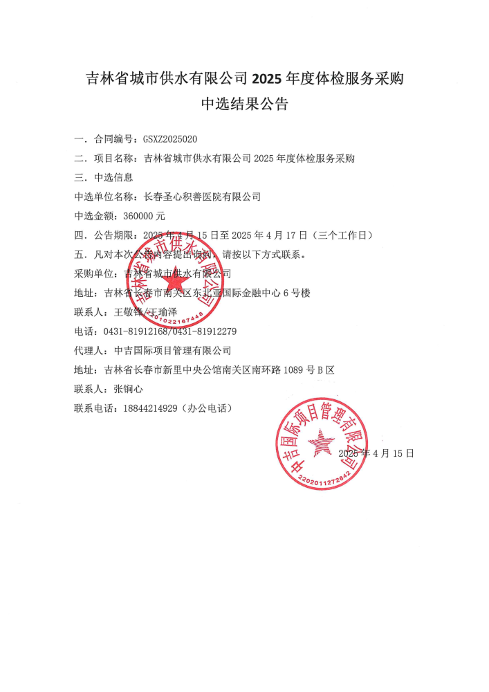 吉林省城市供水有限公司2025年度体检服务采购中选结果公告
