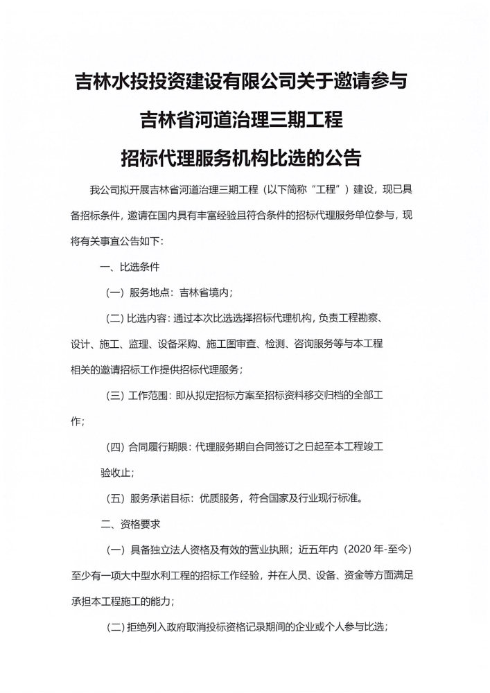 吉林水投投资建设有限公司关于邀请参与吉林省河道治理三期工程招标代理服务机构比选的公告