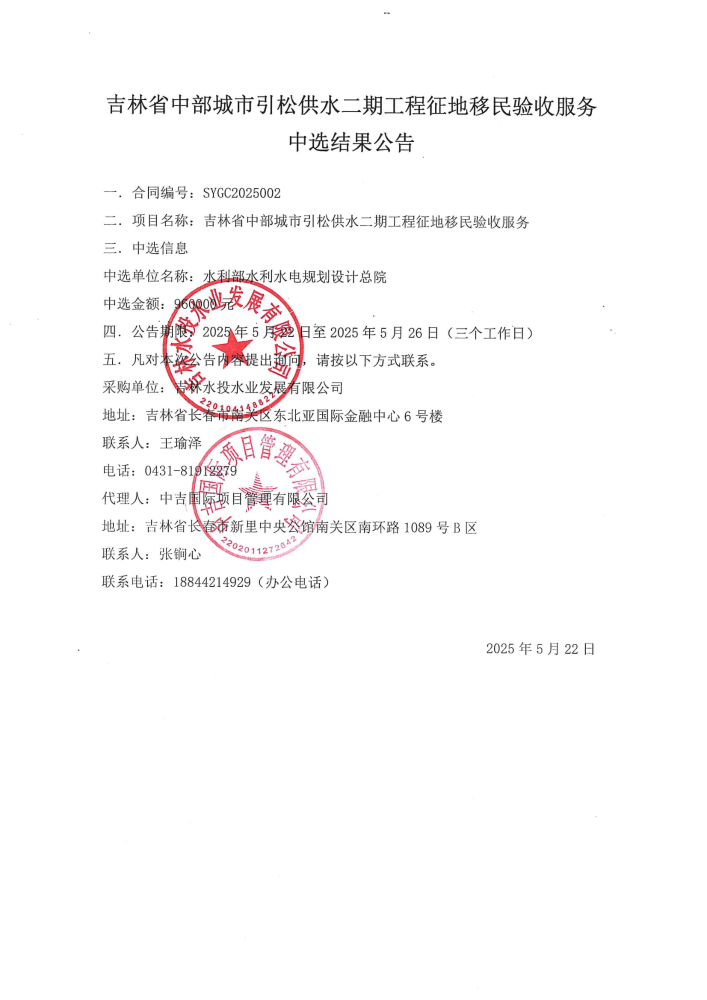吉林省中部城市引松供水二期工程征地移民验收服务中选结果公告