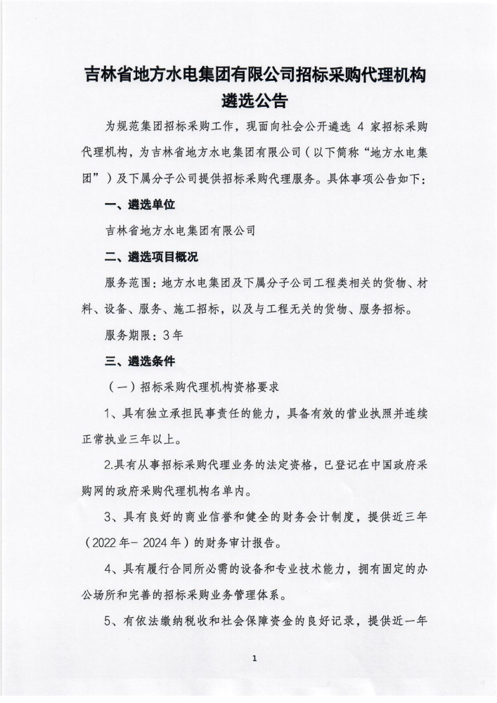 吉林省地方水电集团有限公司招标采购代理机构遴选公告