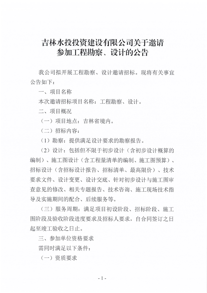 吉林水投投资建设有限公司关于邀请参加工程勘察、