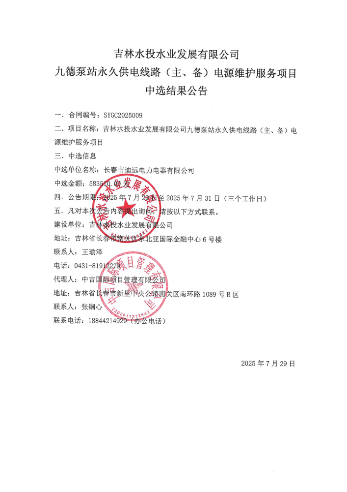 吉林水投水业发展有限公司九德泵站永久供电线路(主、备)电源维护服务项目中选结果公告