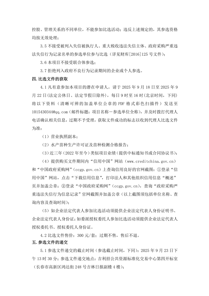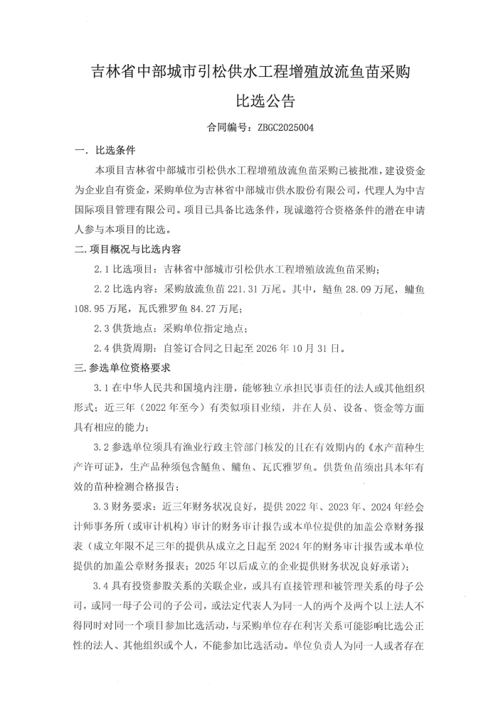 吉林省中部城市引松供水工程增殖放流鱼苗采购比选公告