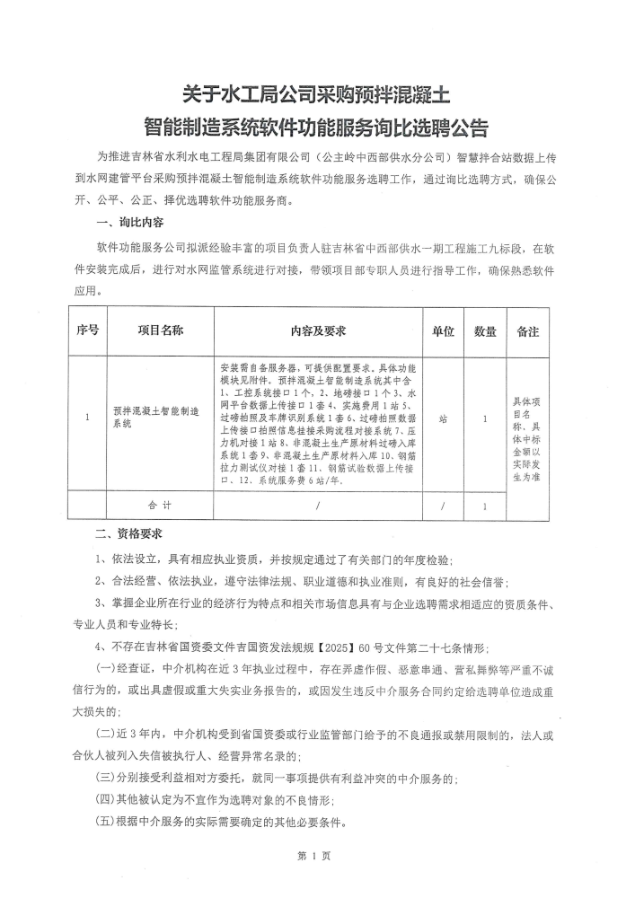 关于水工局公司采购预拌混凝土智能制造系统软件功能服务询比选聘公告