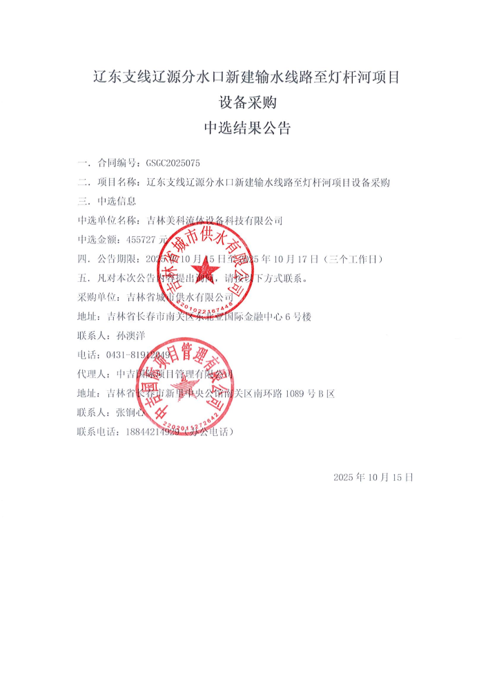 辽东支线辽源分水口新建输水线路至灯杆河项目设备采购中选结果公告