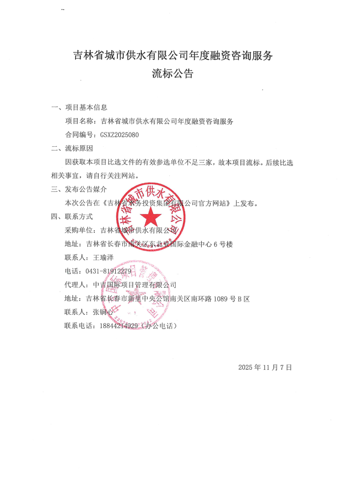 吉林省城市供水有限公司年度融资咨询服务流标公告