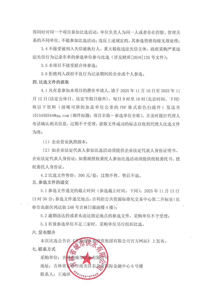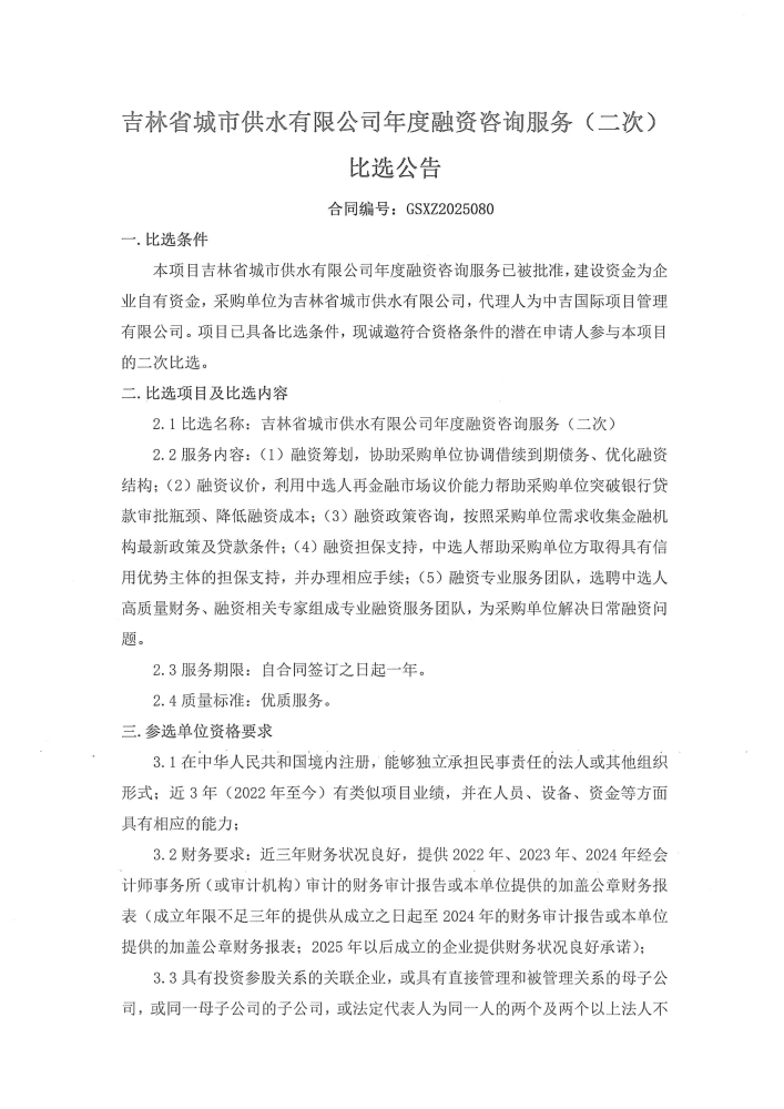 吉林省城市供水有限公司年度融资咨询服务(二次)比选公告