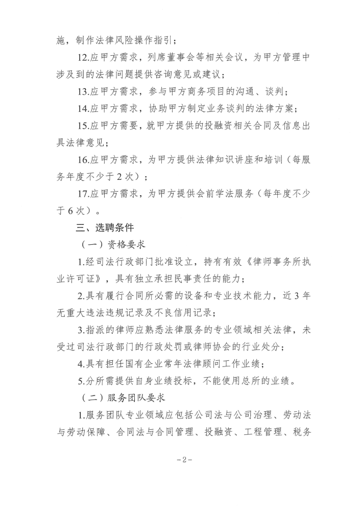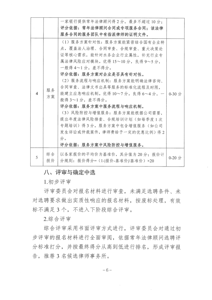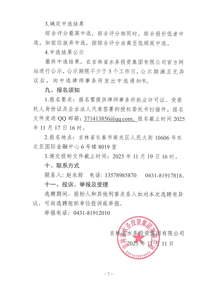 吉林省水务投资集团有限公司常年法律顾问选聘公告(二次)