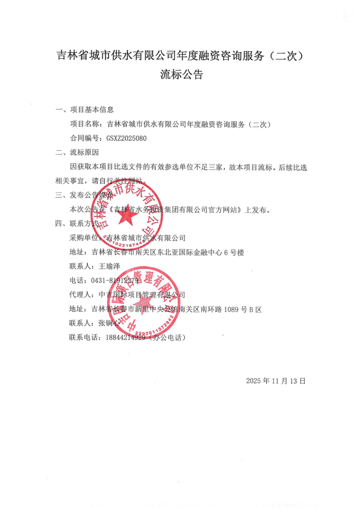 吉林省城市供水有限公司年度融资咨询服务(二次)流标公告