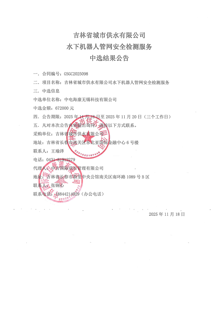 吉林省城市供水有限公司水下机器人管网安全检测服务中选结果公告