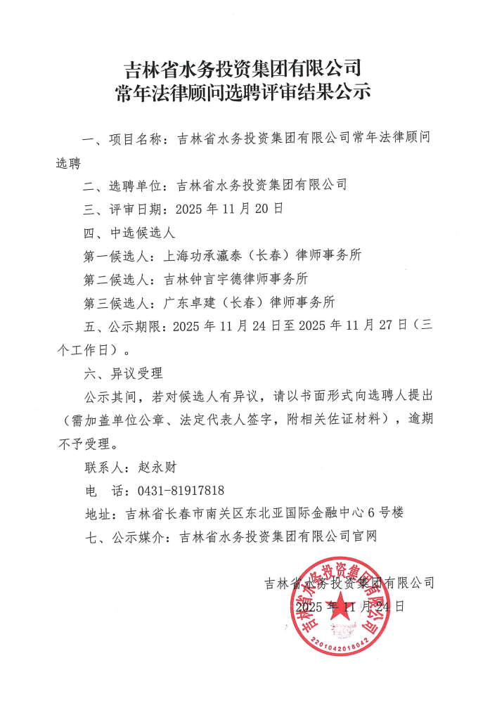 吉林省水务投资集团有限公司常年法律顾问选聘评审结果公示