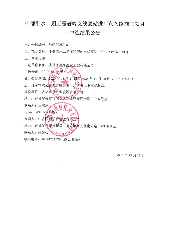 中部引水二期工程奢岭支线泵站进厂永久路施工项目中选结果公告