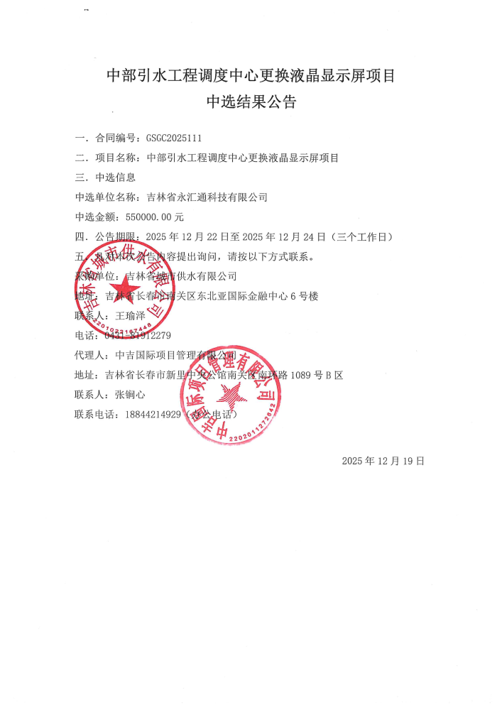 中部引水工程调度中心更换液晶显示屏项目中选结果公告