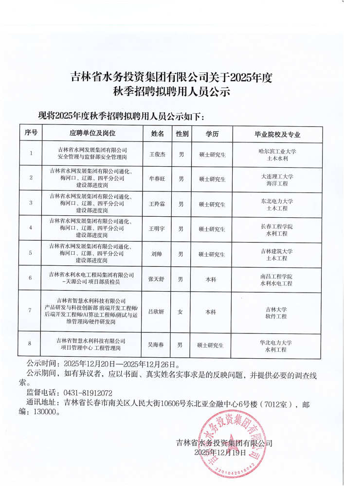 吉林省⽔务投资集团有限公司关于2025年度秋季招聘拟聘⽤⼈员公示