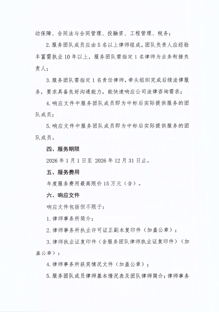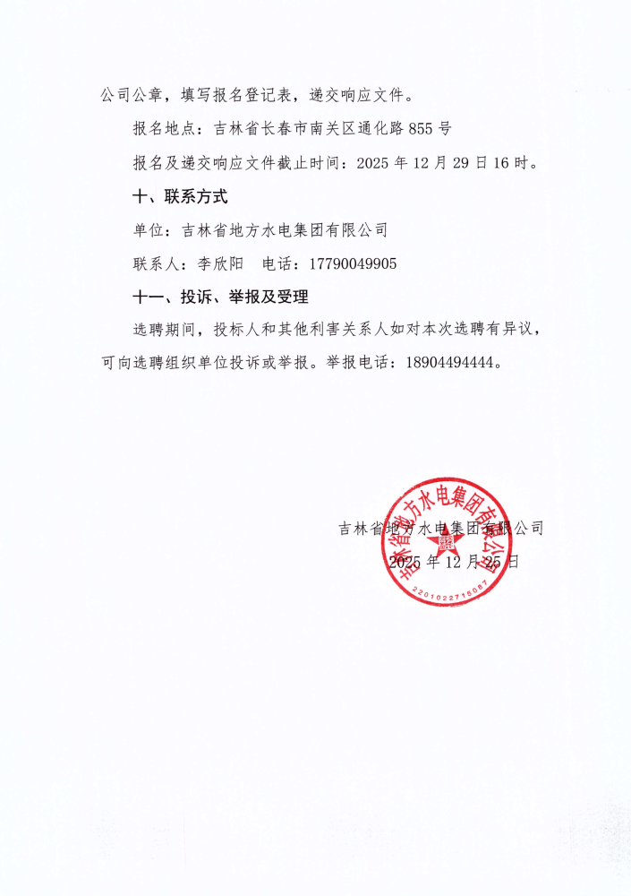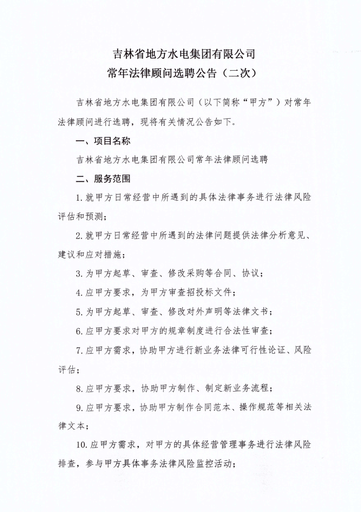 吉林省地方水电集团有限公司常年法律顾问选聘公告(二次)