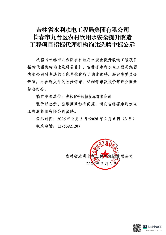 吉林省水利水电工程局集团有限公司长春市九台区农村饮用水安全提升改造工程项目招标代理机构询比选聘中标公示