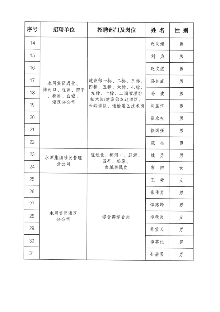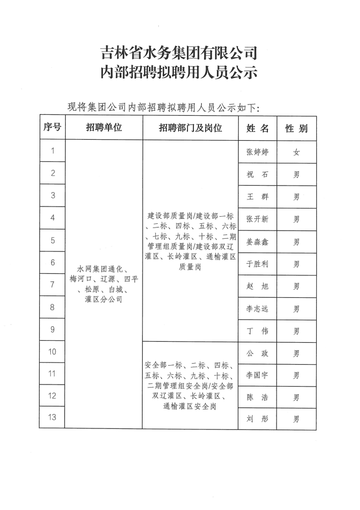 吉林省水务集团有限公司内部招聘拟聘用人员公示