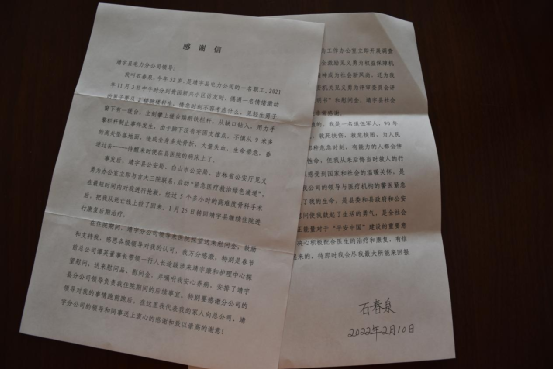 “真是太感谢了!我代表我弟弟石春泉和我们全家向省公司、靖宇分公司的领导和同事给予的关心关爱表示衷心的感谢......我们全家为我弟弟的行为感到光荣,相信他会在咱们公司和社会的关心鼓励下勇敢站起来!”。2022年2月16日,见义勇为职工石春泉的姐姐和女儿带着感恩的心将感谢信送到了靖宇分公司。