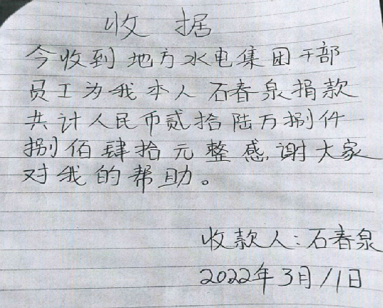 当收到广大干部职工的爱心后,石春泉非常感谢和激动,他表示一定不辜负组织的关心和大家的期望,坚持好好康复,争取早日站起来,以更加昂扬的斗志和壮举,回报社会。