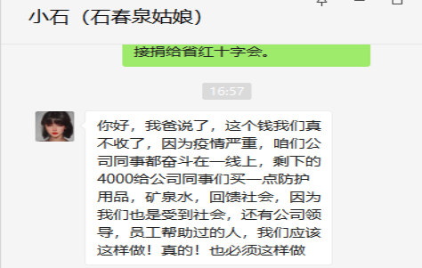 事情出乎毛鸿婷的意料。她第一时间将这一突发情况向公司党委做了汇报。经公司党委成员之间的沟通研究,考虑到石春泉家庭状况且尚在康复期,日后还需要高额的治疗费用不建议他捐款金额过高,留一千元由公司代捐到吉林省红十字会,剩余的四千元返回给石春泉。并告诉石春泉,往地方电力靖宇分公司也不要转去太多资金,表达心意即可。随后,毛鸿婷将四千元通过微信返还给了石春泉女儿,石春泉坚决拒绝,当时就让其女儿按了退回键。并在微信上回复:“我爸说了,这个钱我们真不收了,因为疫情严重,咱们公司同事都奋斗在一线上,剩下的四千元给公司同事们买一点防护用品,矿泉水,回馈社会,因为我们也是受到社会,还有公司领导,员工帮助过的人,我们应该这样做!真的!也必须这样做”。