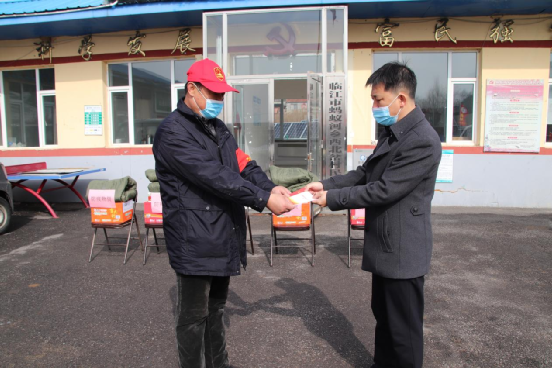 物资到位。筹备防疫物资,及时发放到位。目前,发放消毒液270瓶、酒精10瓶、口罩1400支,大衣8件、方便面、火腿肠、水各10件,同时也为包保六道沟砬台村和西北岔村送去了防控物资。