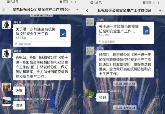 发电抚松分公司疫情防控领导小组全面启动疫情防控应急预案,在微信工作群转发地方水电集团《关于进一步加强当前疫情防控和安全生产工作的通知》,并对公司各电站、部门疫情防控工作提出具体要求:一是要充分认识本次疫情防控任务的艰巨性,在思想上高度重视;二是全力做好发电保障工作,确保发电生产有序进行;三是切实做好春季防火工作,坚决杜绝火灾事故发生;四是加强隐患排查治理,做到“应查必查,应改必改”;五是强化工作责任落实,各级领导干部要全力抓好公司当前形势下的生产经营工作。