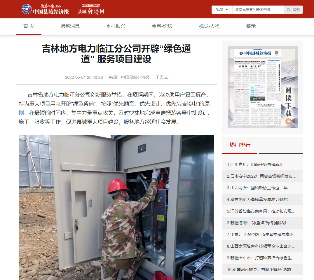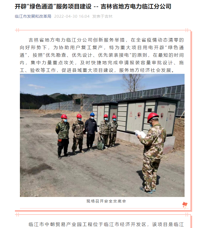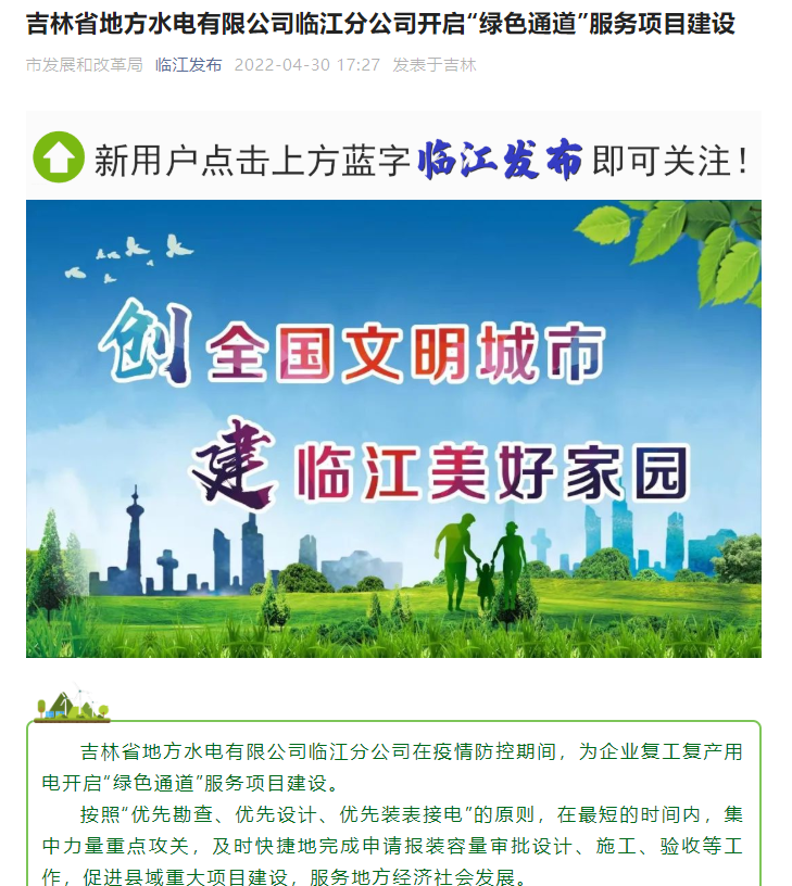 吉林省地方电力临江分公司创新服务举措,在疫情期间,为协助用户复工复产,特为重大项目用电开辟“绿色通道”,按照“优先勘查、优先设计、优先装表接电”的原则,在最短的时间内,集中力量重点攻关,及时快捷地完成申请报装容量审批设计、施工、验收等工作,为促进县域重大项目建设,服务地方经济社会发展跑出了加速度。分公司工作的高效率、服务的高质量得到了临江市政府相关部门的高度肯定,先后在临江市发展和改革局、临江发布公众号和中国县域经济报上进行了报道。