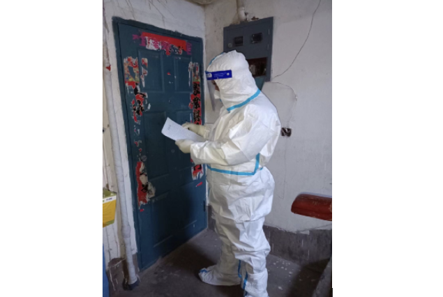 随着疫情的发展,第二轮疫情防控大走访大排查工作启动。这一轮的走访排查将居民的健康状况纳入调查范围,要求更高,内容更细,任务更重。为更好地完成调查任务,冒着可能被感染的风险逐门逐户地为居民核对信息,由于劳累加上受凉犯了胃痉挛,疼的他直冒冷汗,但他没有因此耽误工作。 为了不漏一户、不落一人、 结果精准,他在完成入户任务后,回去还需要认真核对数据,反复确认摸排结果。