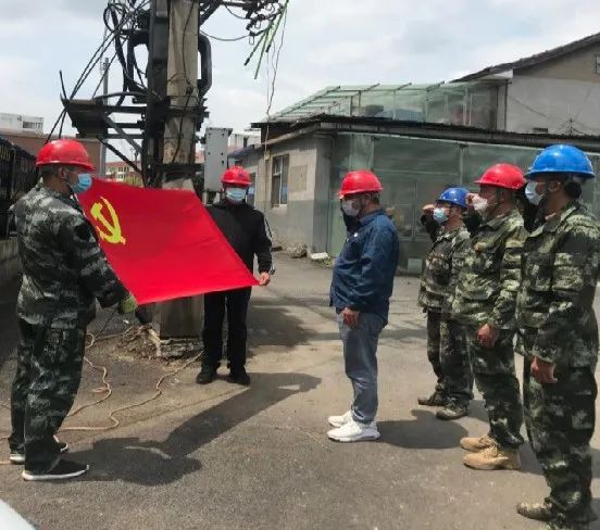 在10千伏西江线变台增容工作现场,城南党支部书记带领大家面对党旗,重温入党誓词。