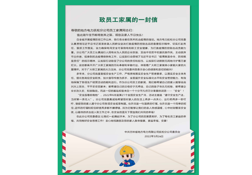 6月16日,结合全国第21个安全生产月之际,为切实强化“基层建设年”活动,实现党建工作与生产经营融合共赢,在地方水电集团党委的安排部署下,地方电力抚松分公司开展“党建+亲情寄语助安全”活动,通过致全体员工家属的一封安全家书的形式,征集员工家属暖心“安全亲情寄语”、“安全亲情全家福照片”,将亲情理念引入“党建+安全生产”工作,加强家庭安全思想宣传,牢固树立“生命至上、安全第一”的观念。
